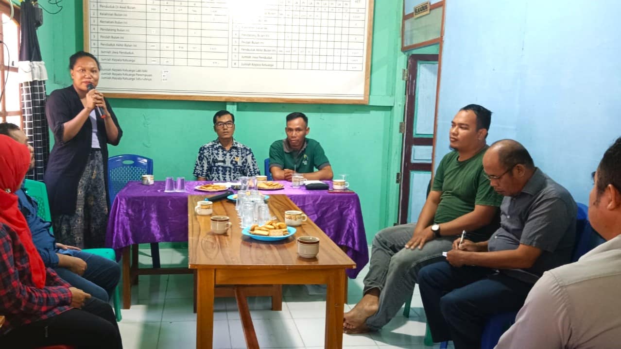 Teks foto: Andina Anastasia Krey (berdiri) dari Donor, memberi kata sambutan di Balai Desa Nusa Kenyikap, Kecamatan Belimbing, Kabupaten Melawi, Kalimantan Barat, Rabu, 13 Juli 2023. Dokumen foto: Heri Irawan/SUAR
