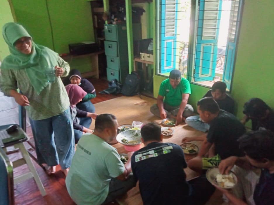 Teks foto: Direktur Perkumpulan SUAR, Sukartaji bersama penggiat SUAR makan bersama di waktu istirahat rapat perencanaan pelaksanaan program PAHAM di kantor Perkumpulan SUAR di jalan Drs Suparjan dusun Gelora Juang desa Kenual kecamatan Nanga Pinoh, Kabupaten Melawi, Kalimantan Barat, Selasa, 4 Juni 2023. Dokumen foto: SUAR